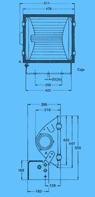 La caja porta equipo esta diseñada para contener el balasto, capacitares e ignitores que necesita la lámpara para ser utilizada y sirve al mismo tiempo para la fijación del proyector.  Su construcción es de chapa de hierro cincado.